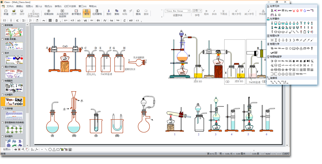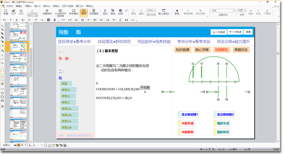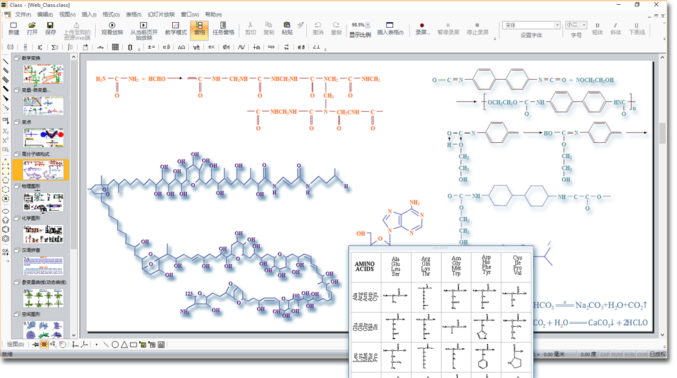 轻松创建化学教案,展现化学学科所涉及的文字、公式符号、化学反应式、高分子结构式、曲线图、化学实验图形等,并可直接应用音频、视频、Flash等信息资源。