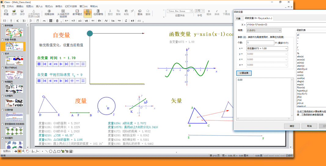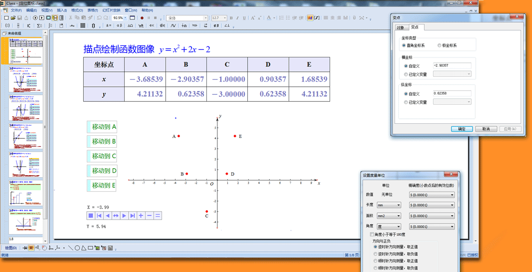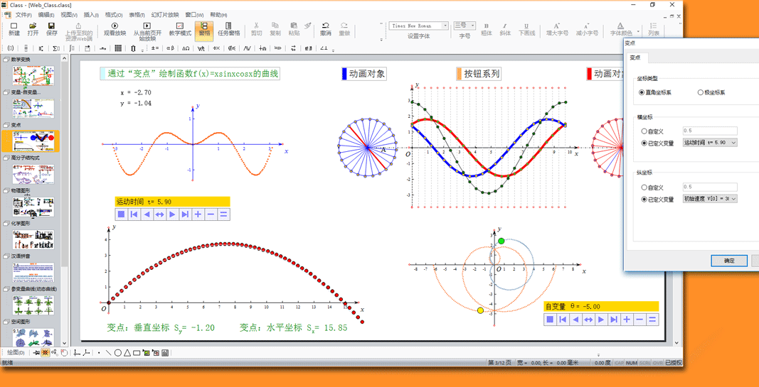 依据自变量、函数变量、度量值创建二维坐标系上的点,当变量或数值发生变化时,触发“变点”发生变化,直观的展示各种函数曲线的生成过程及形状变化。