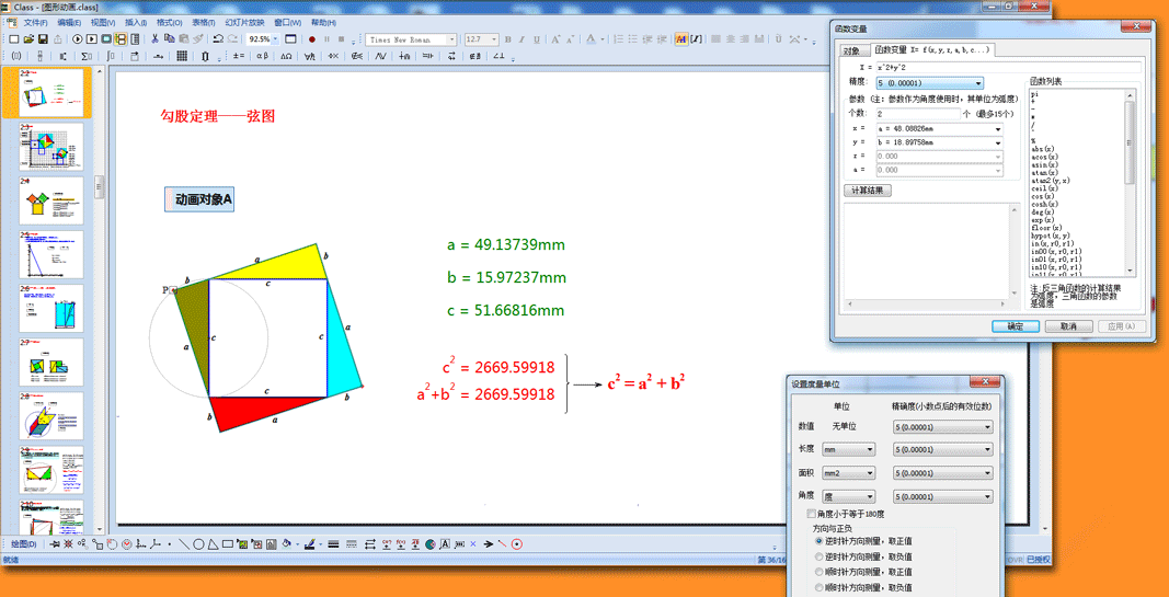 基于原始动画图形,引入变量(如:自变量、函数变量、矢量、度量值),通过图形变换(平移、缩放、旋转、对称等)、变点应用,获得衍生图形,当变量变化时,将动态展示图形的变化情况。