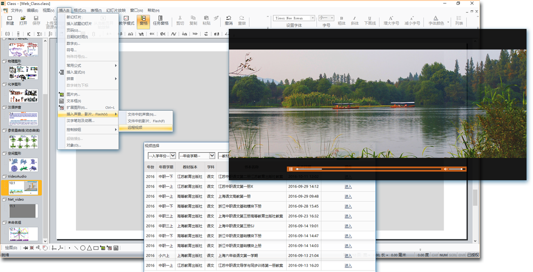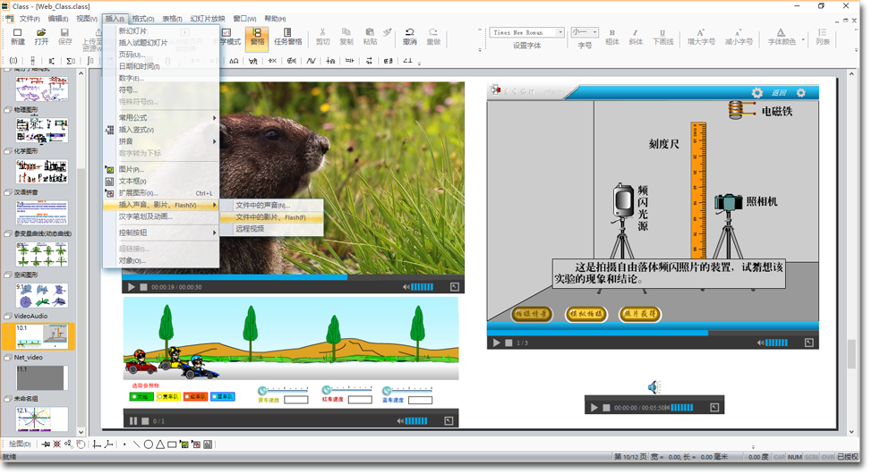 直接插入Video、Audio、Flassh多媒体文件。 并可在编辑环境、播放状态、教学模式三种模式下自由播放。