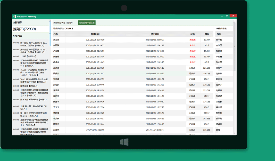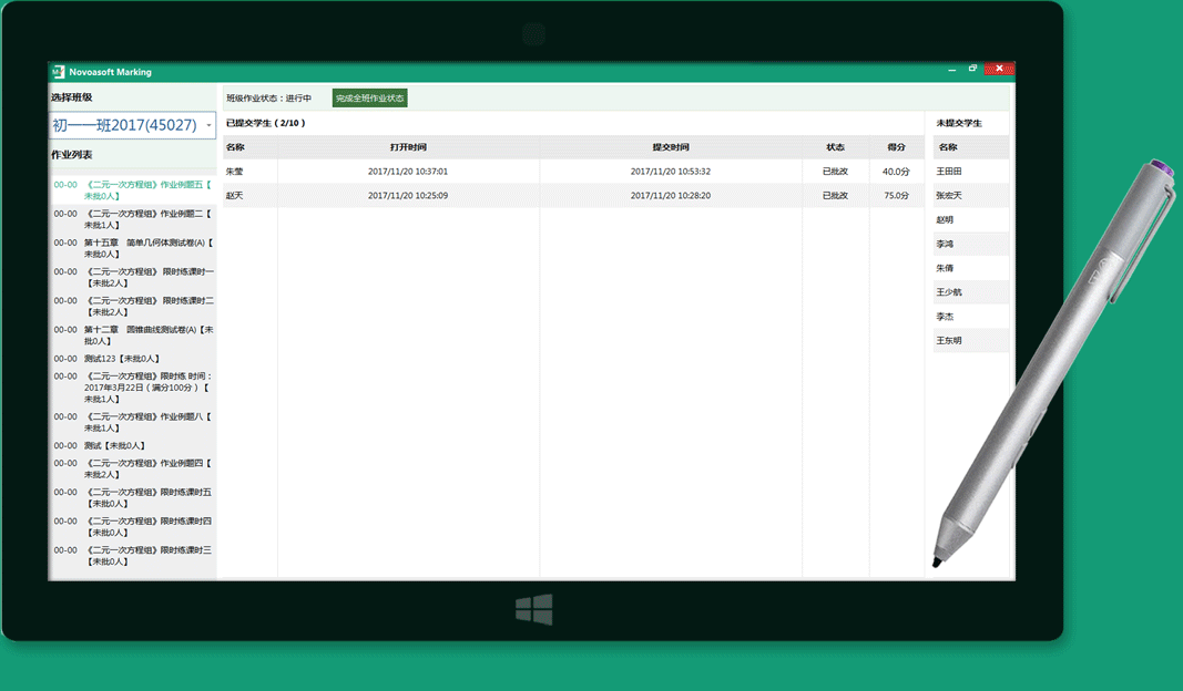 选择所教班级,列表出所有已布置作业;每份作业的完成情况一清二楚,批改状况了然于胸;并将未交作业的学生列表出来,做到心中有数。